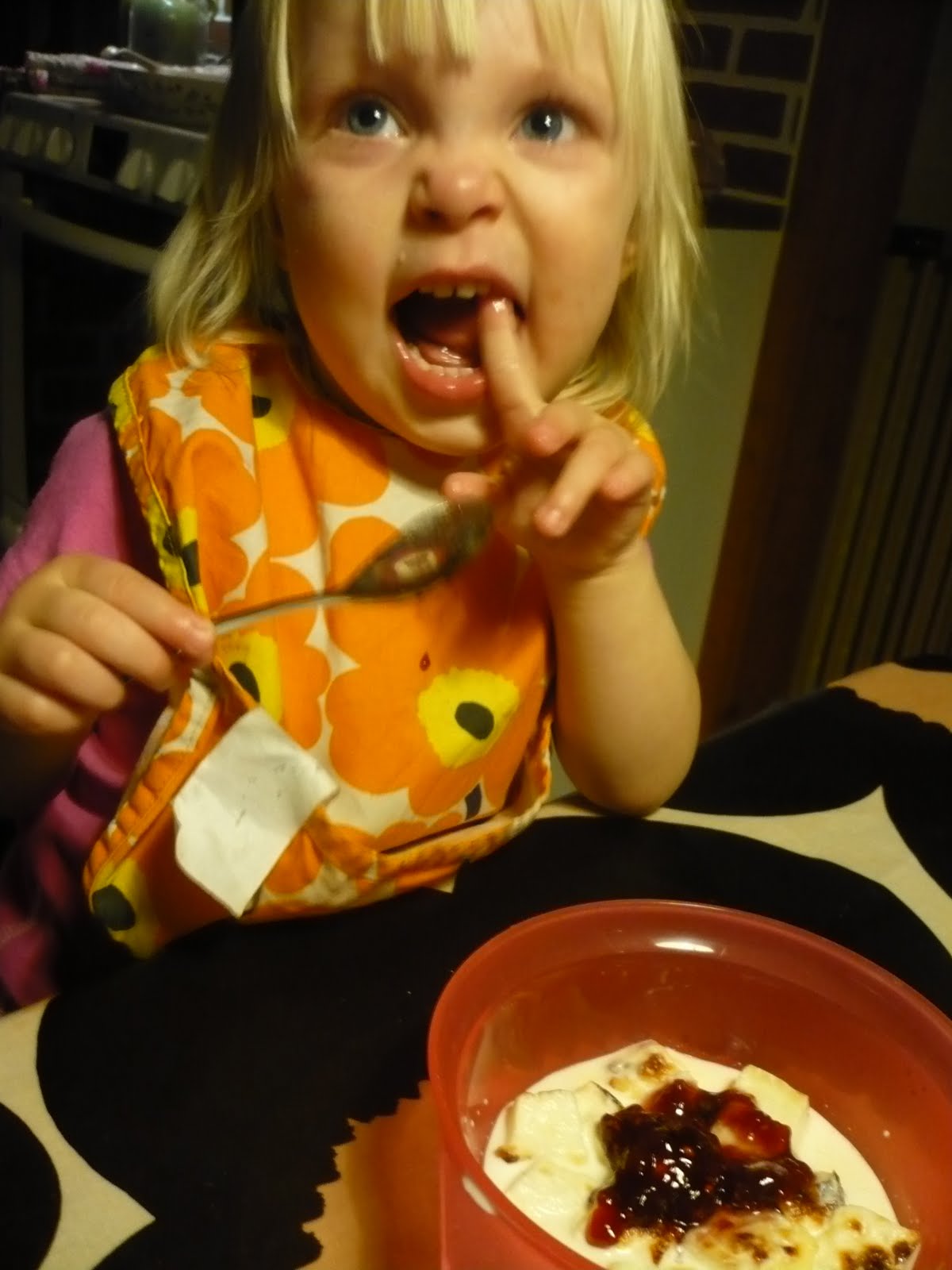 Iltapalalla vähän herkuteltiin. Hillan kummit toivat itse tehtyä leipäjuustoa viikonloppuna. Nyt se piipahti uunissa kerman kera ja sai seurakseen Englannin tulijaisena saatua vadelmahilloa.